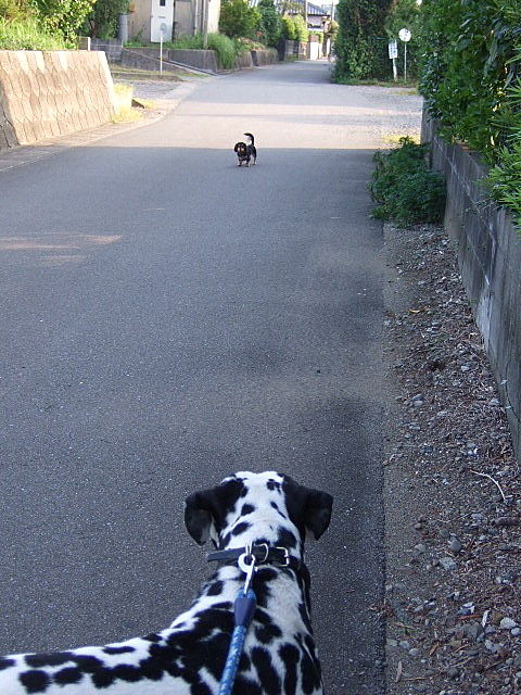 ミニダックス君、こっちも散歩中にフェンス越しやリードでつながれても「ワンワン」吠えられますよ、でも孔明は知らん顔・・・