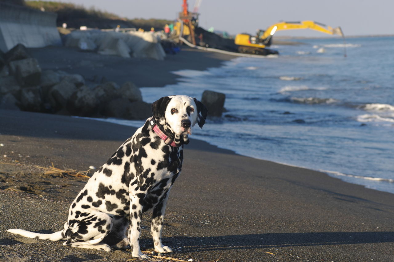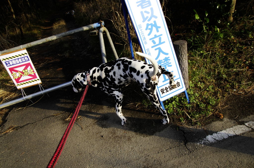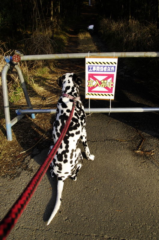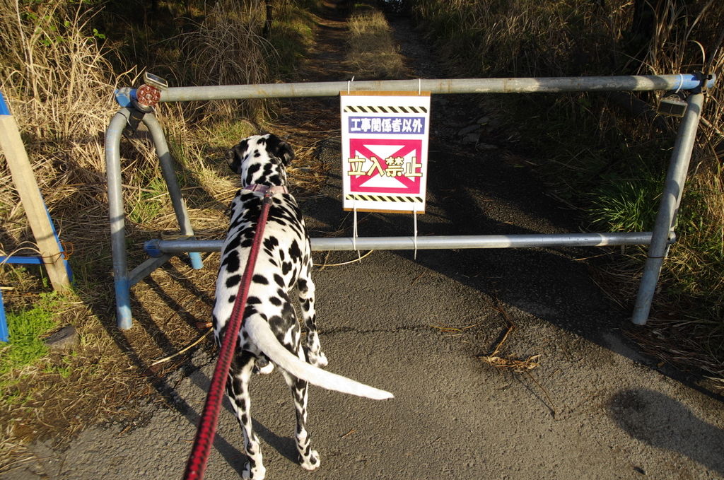 昨年からボスの遊び場所の浜辺は護岸工事が行われていて、普段は関係者以外は立ち入りできないようになっている。工事が行われていない早朝や夜には浜辺に出られると思うが、浜辺の入口付近にはこのように立ち入り禁止の立て札がかけられているし、メインの入り口には、警備の人が立っている。
