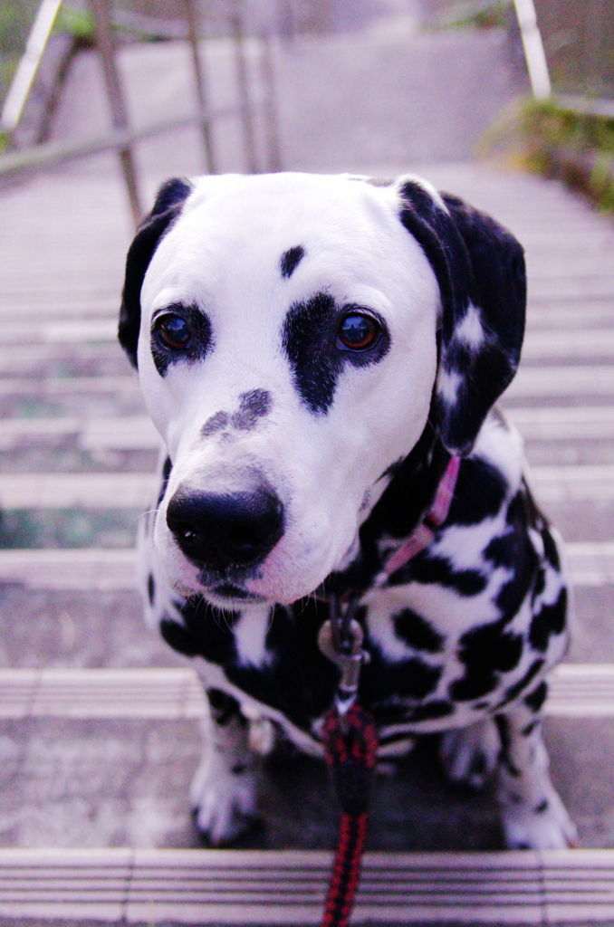 2枚目の写真は、長い階段の途中で一休み中のボス。ボスは階段の昇り降りでは一気に駆け上がろうとしたり、駆け下りようとするので、飼い主が足を取られかねない事もあって、必ず途中休憩させることにしている。もう日が暮れた頃だから、この写真のシャッタースピードは、1/50秒。17-50mmとはいえ、一応単焦点レンズなので、それなりに写りが良い^^