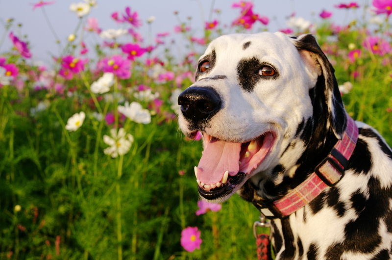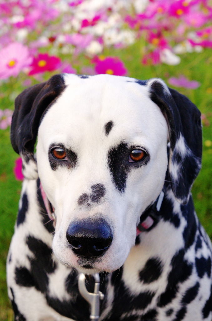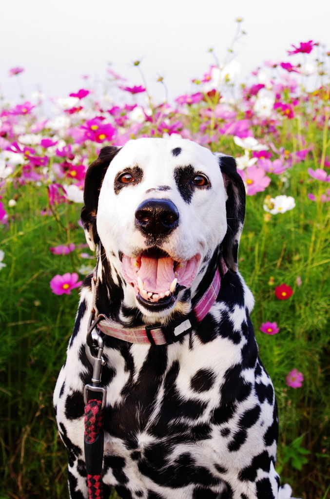 ときには、こんなふうに笑顔を振りまいているように見える写真も撮らせてくれるが…(笑) でも、飼い主にとって、この時期はダルメシアンよりコスモスなわけで(笑)、右手に一眼レフカメラとウン◎バッグ、左手にリードを持って、コスモスの撮影に夢中になる^^