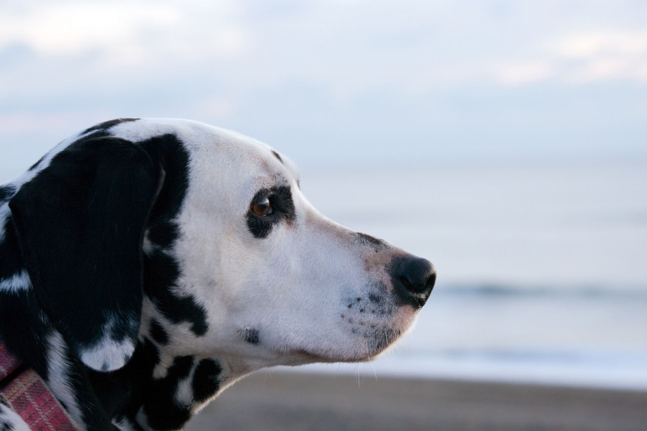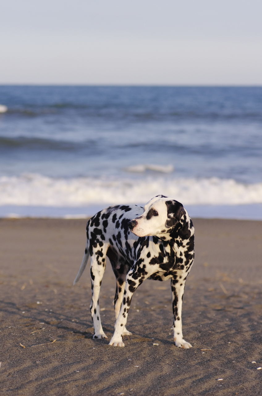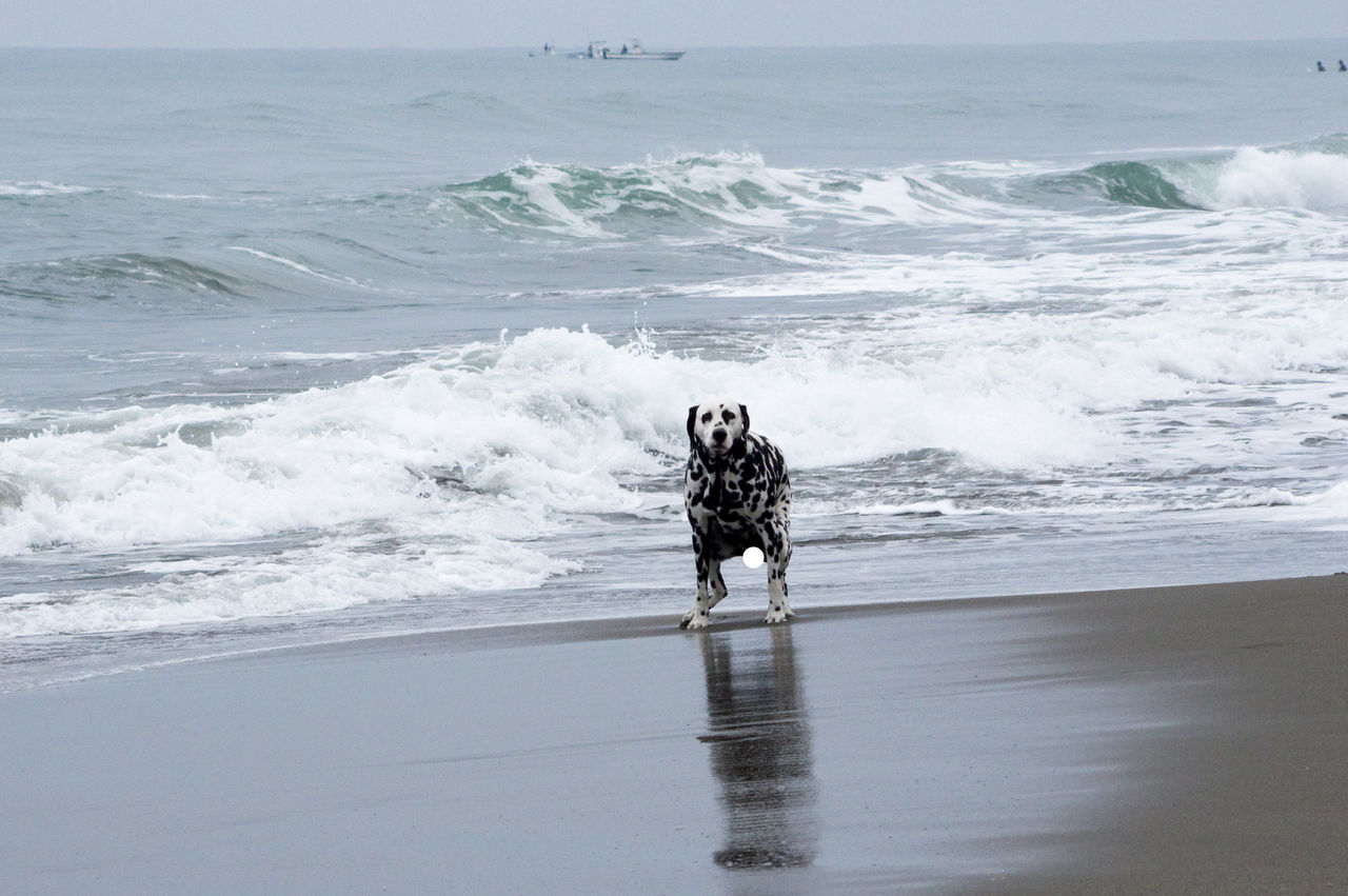 浜辺につくと、案の定といいますか、ヒラメか何かを狙っている釣り人たちが数人釣りを楽しんでおりましたので、ボスは浜辺に降りることができませんでした。この写真は、ボスを堤防に座らせて、撮ったものですが、やはり来年の2月には9歳になるダルメシアンだけあって、少し老けてきましたね・・・^^ 上から撮りますともう少し若く見えるのですが、首やあごが入るように撮ってしまうと年齢を隠せないようです(人間と同じかも・・・(笑))。