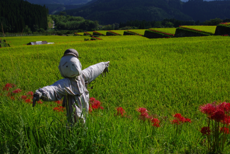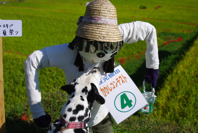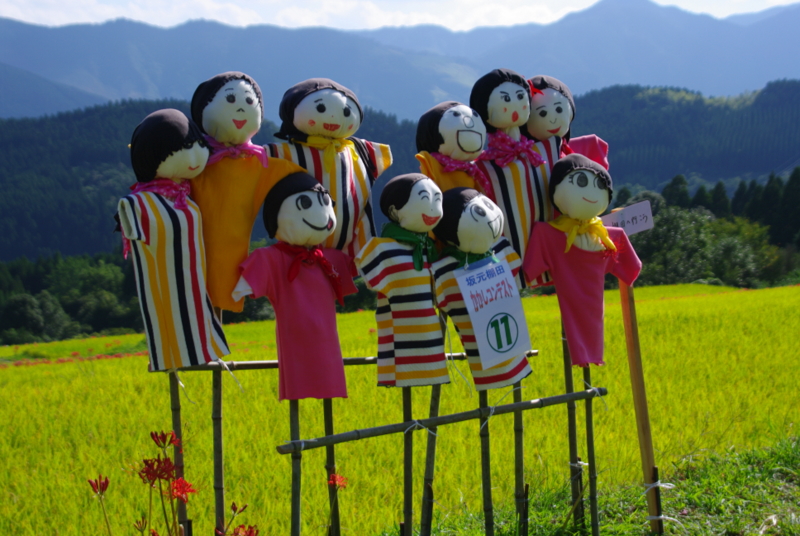 こちらは、宮崎県日南市にある棚田での一コマ。かかしコンテストの様子ですが、ボスは4番が気に入ったそうです(爆)
