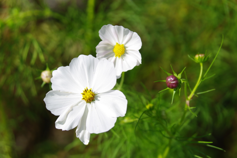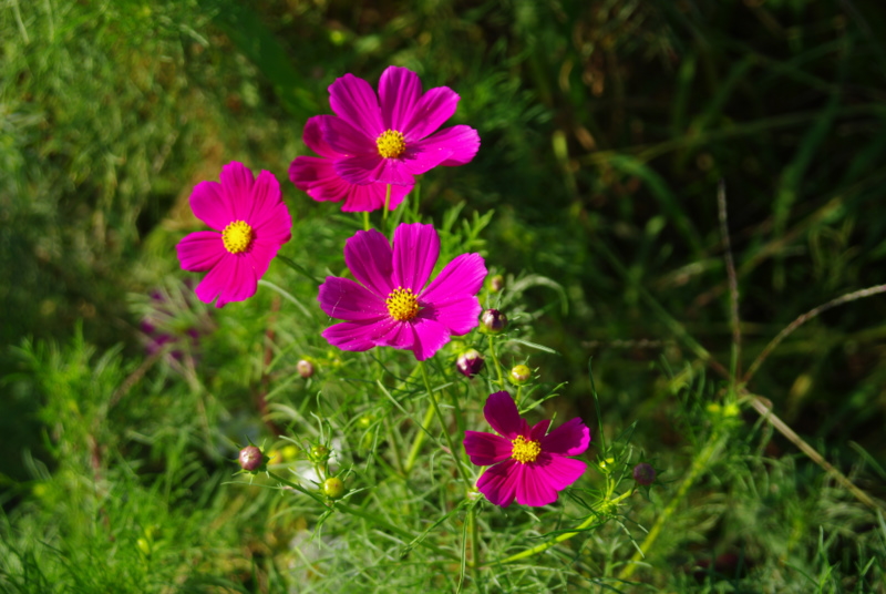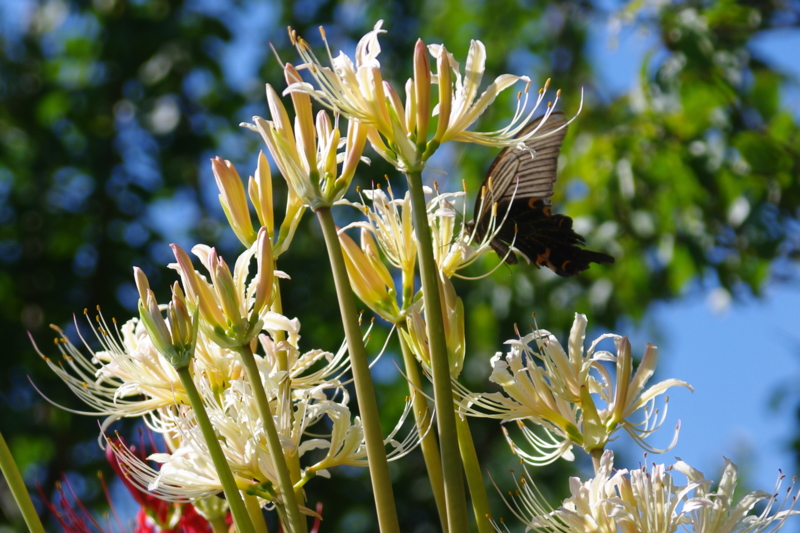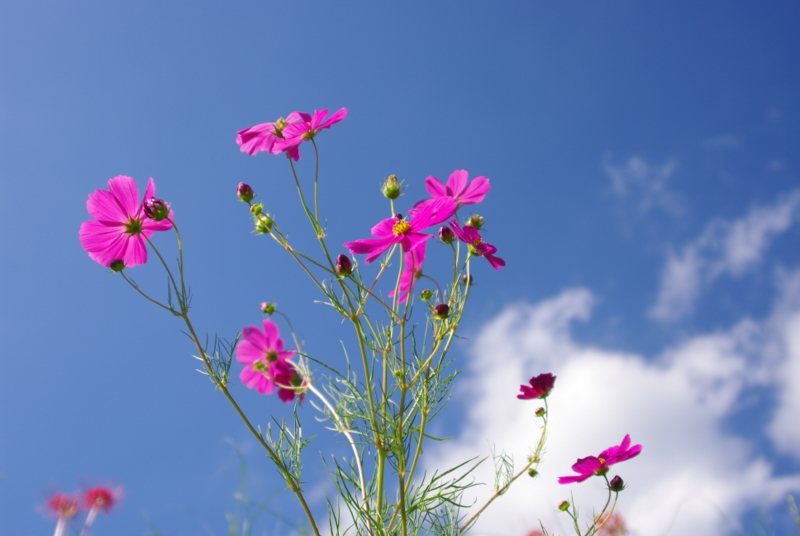 彼岸花は見頃を過ぎたくらいで、コスモスは咲き始めという感じでした。背の高いコスモスがありましたので、青空を背景に撮ってみました。